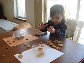 The next day, we continued with the throwing concept, but with food this time. What kid wouldn't want to throw food at their sibling? I had two bags of Teddy Grahams; one chocolate and one vanilla. I set two containers in the middle of the table with the appropriate colored construction paper underneath. The object was to throw the right colored Teddy Graham in the appropriate container. Stephen really enjoyed the game even if he didn't completely follow the rules. Rhea had other plans and decided that sorting was more fun that throwing. I only recommend this activity if you have a couple dogs to clean up the floor for you ;-)